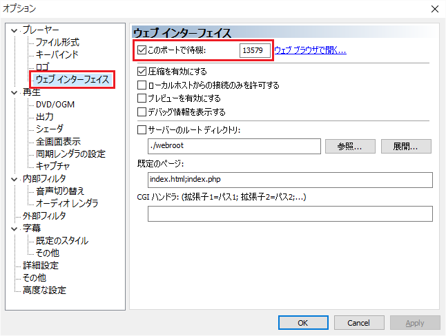 Media Player Classicをご使用される場合 web interface を有効にしてください。