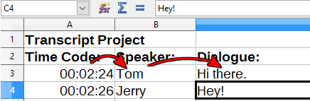 テーブル、またはスプレッドシート、にタイムコード入りの筆記[1]を行う。